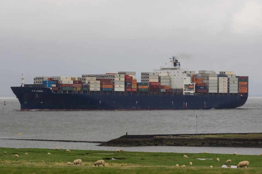 Containerschiff elbabwärts vor Cuxhaven-Altenbruch am 13.08.2016