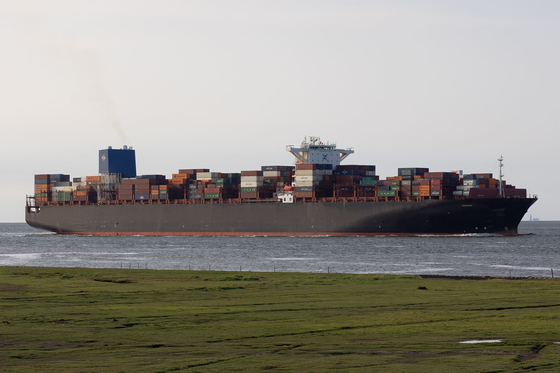 Containerschiff elbaufwärts vor Cuxhaven-Altenbruch am 09.06.2020