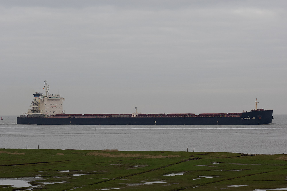 Massengutfrachter elbaufwärts vor Cuxhaven-Altenbruch am 15.01.2021