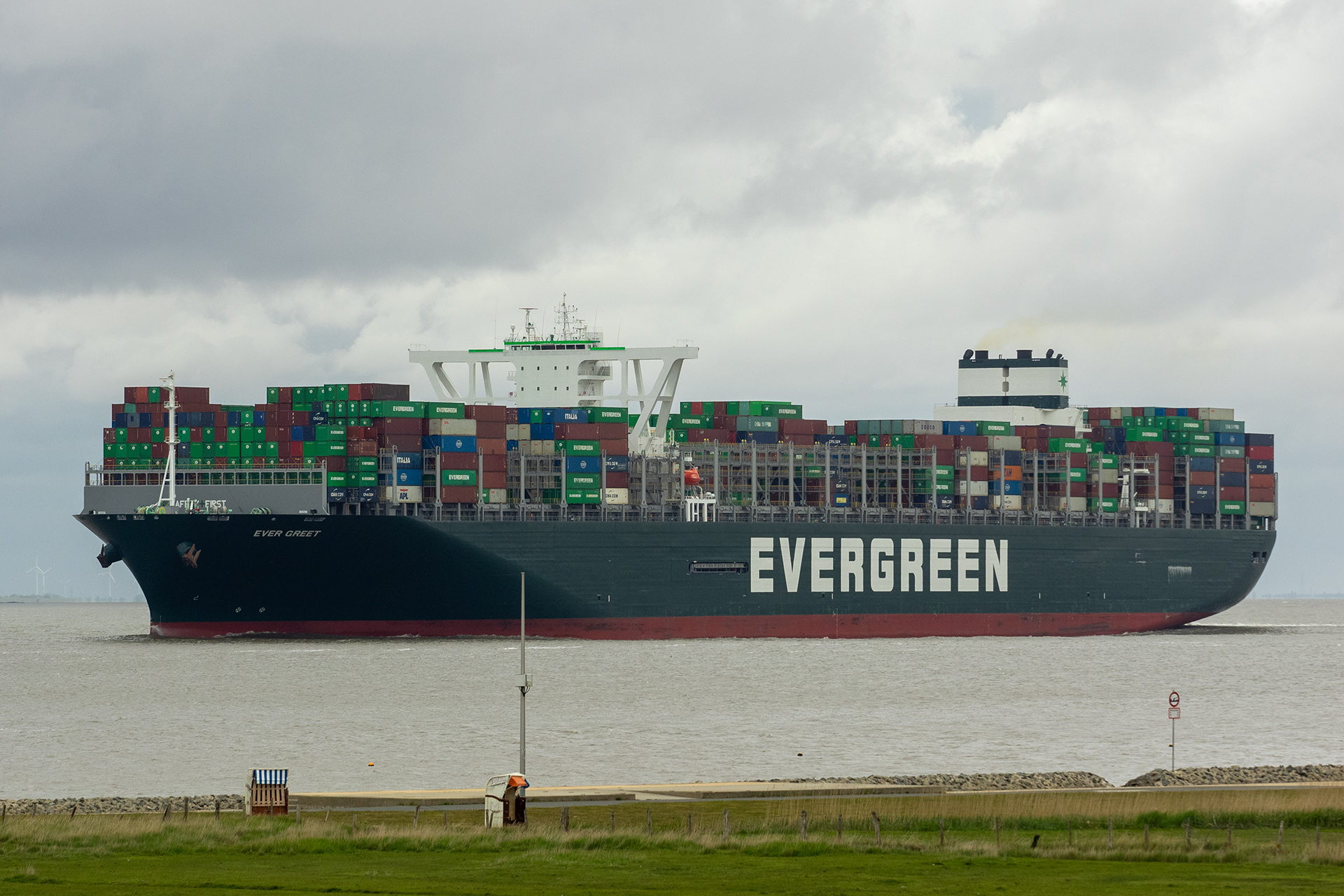 Containerschiff elbabwärts vor Cuxhaven-Altenbruch am 15.05.2020