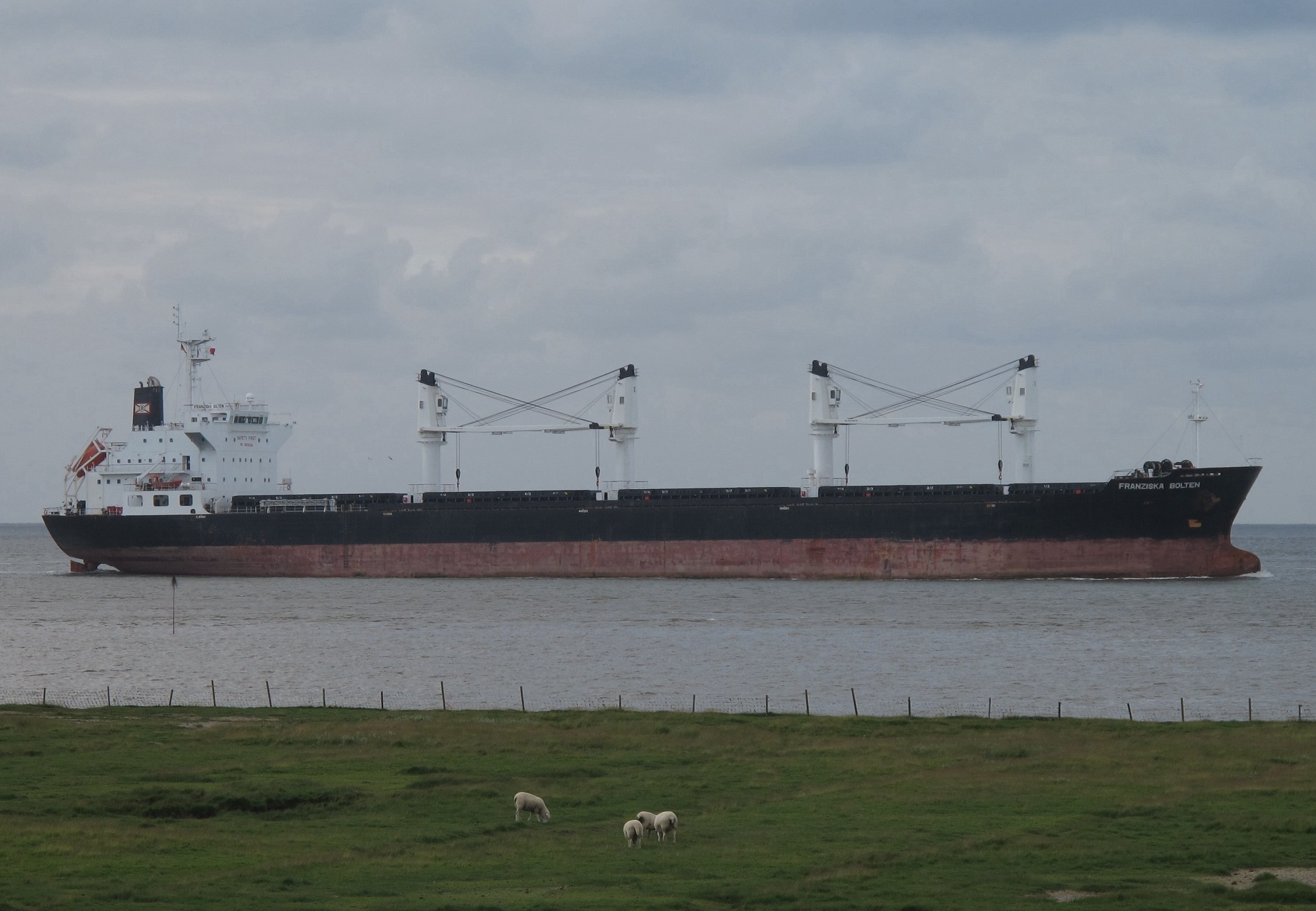 Frachtschiff elbaufwärts vor Cuxhaven-Altenbruch am 13.05.2012
