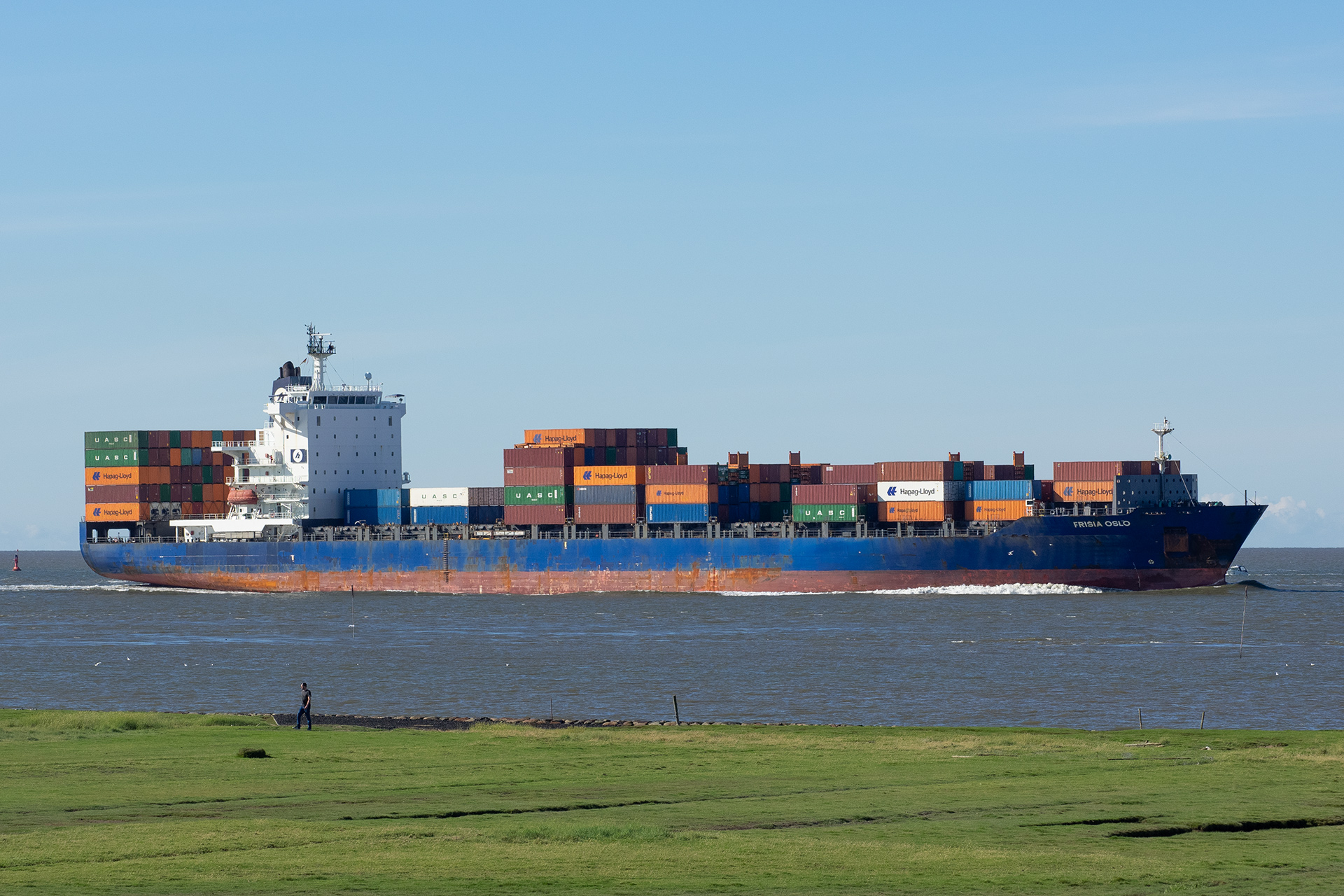 Containerschiff elbaufwärts vor Cuxhaven-Altenbruch am 12.07.2020