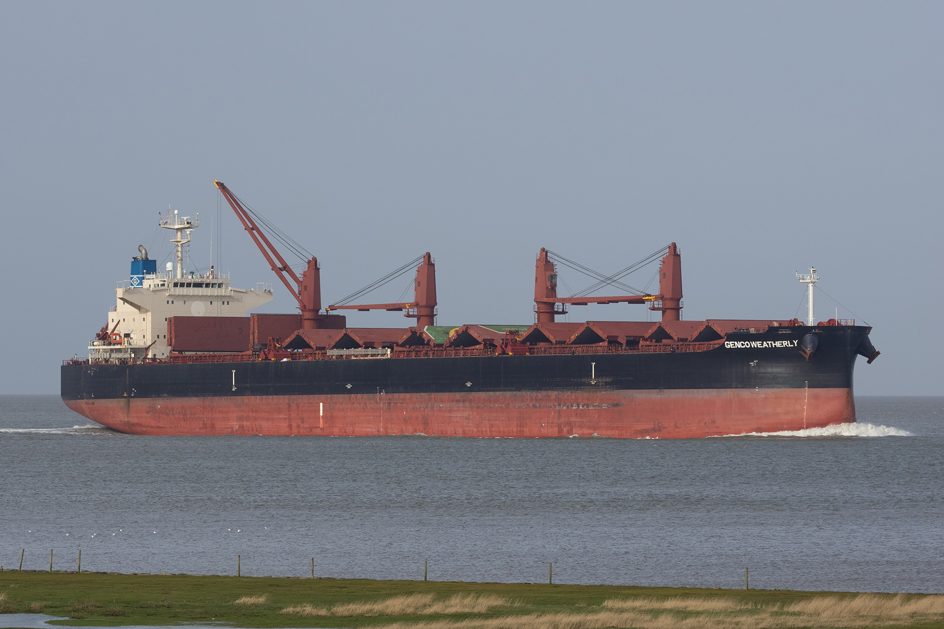 Massengutfrachter elbaufwärts vor Cuxhaven-Altenbruch am 21.02.2020