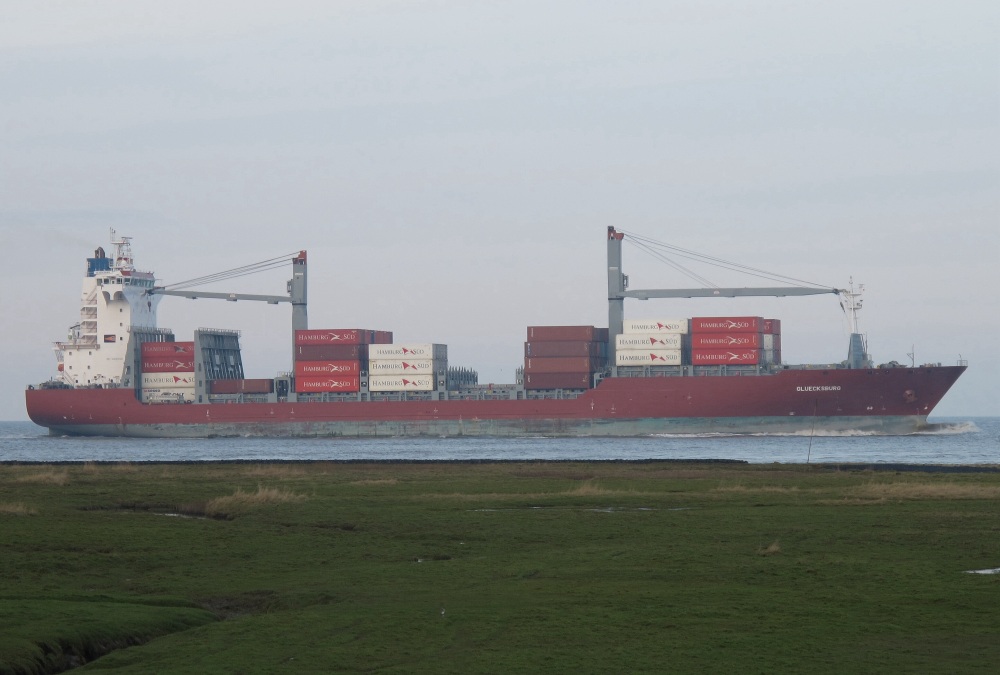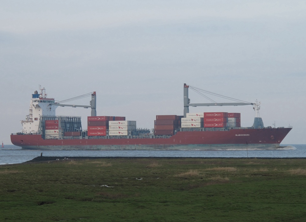 Frachtschiff elbaufwärts vor Cuxhaven-Altenbruch am 25.01.2012