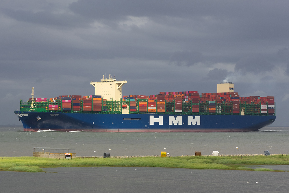 Containerschiff elbabwärts vor Cuxhaven-Altenbruch am 05.07.2020