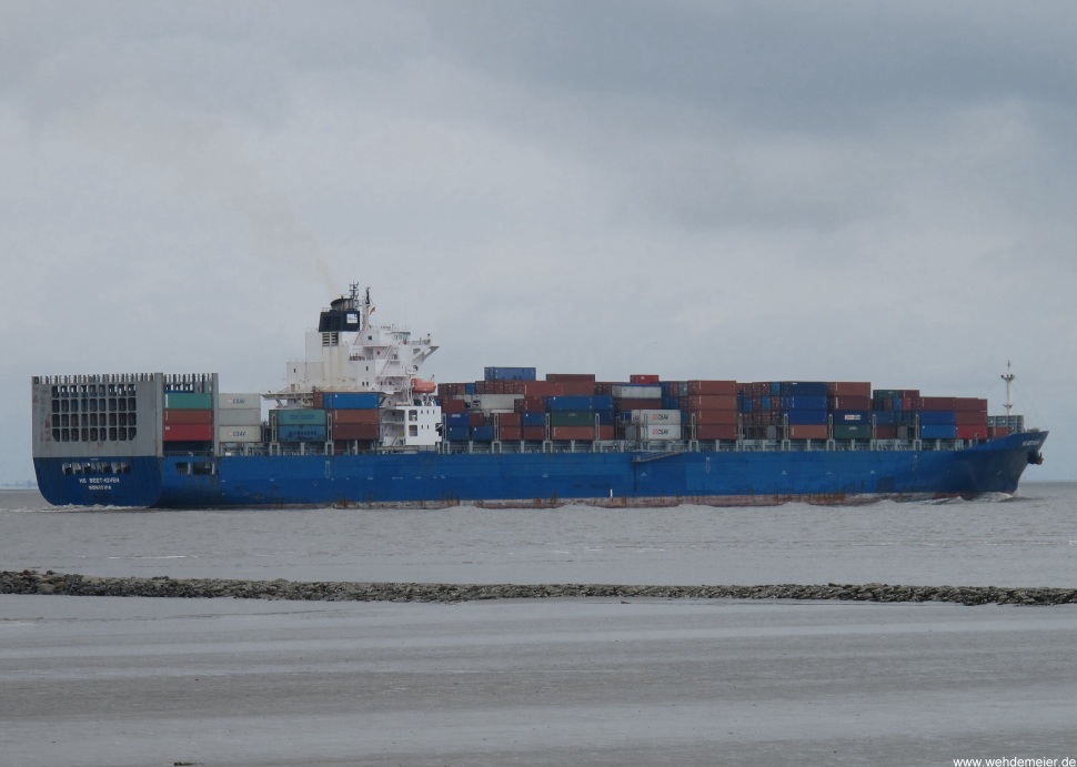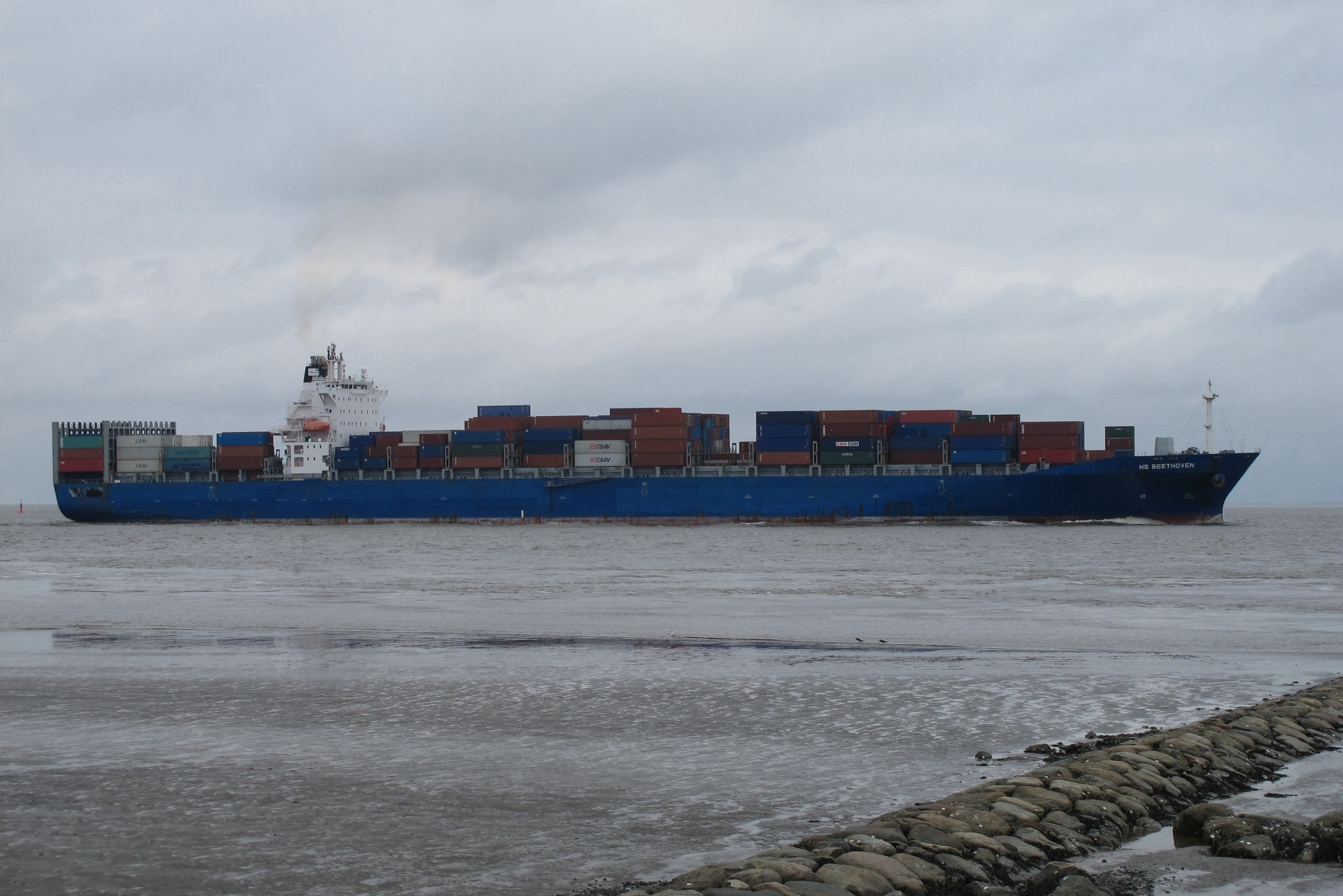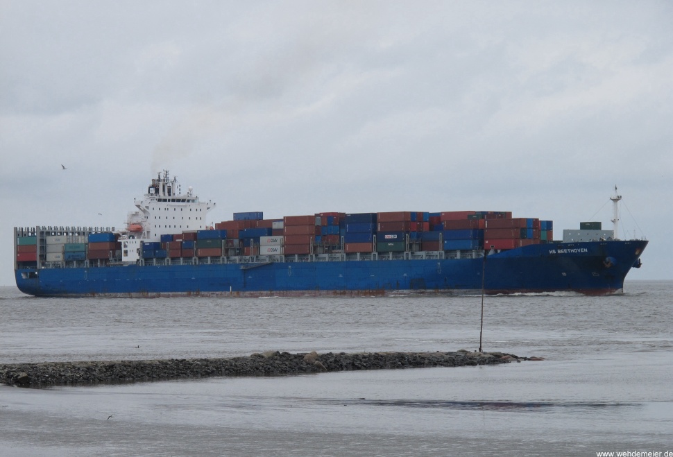 Containerschiff elbaufwärts vor Cuxhaven-Altenbruch am 05.04.2010
