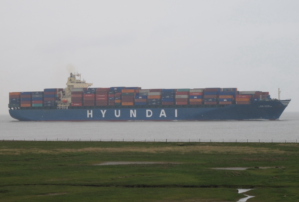 Containerschiff elbaufwärts vor Cuxhaven-Altenbruch am 09.04.2012