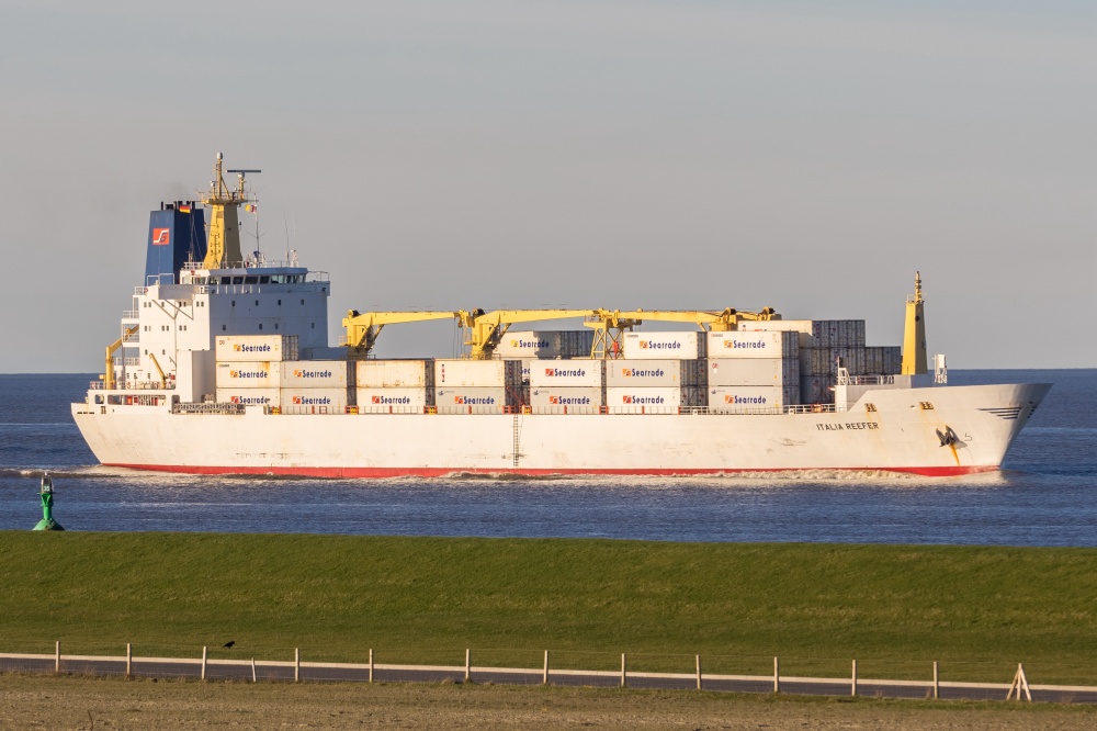 Frachtschiff elbaufwärts vor Cuxhaven-Altenbruch am 16.02.2016