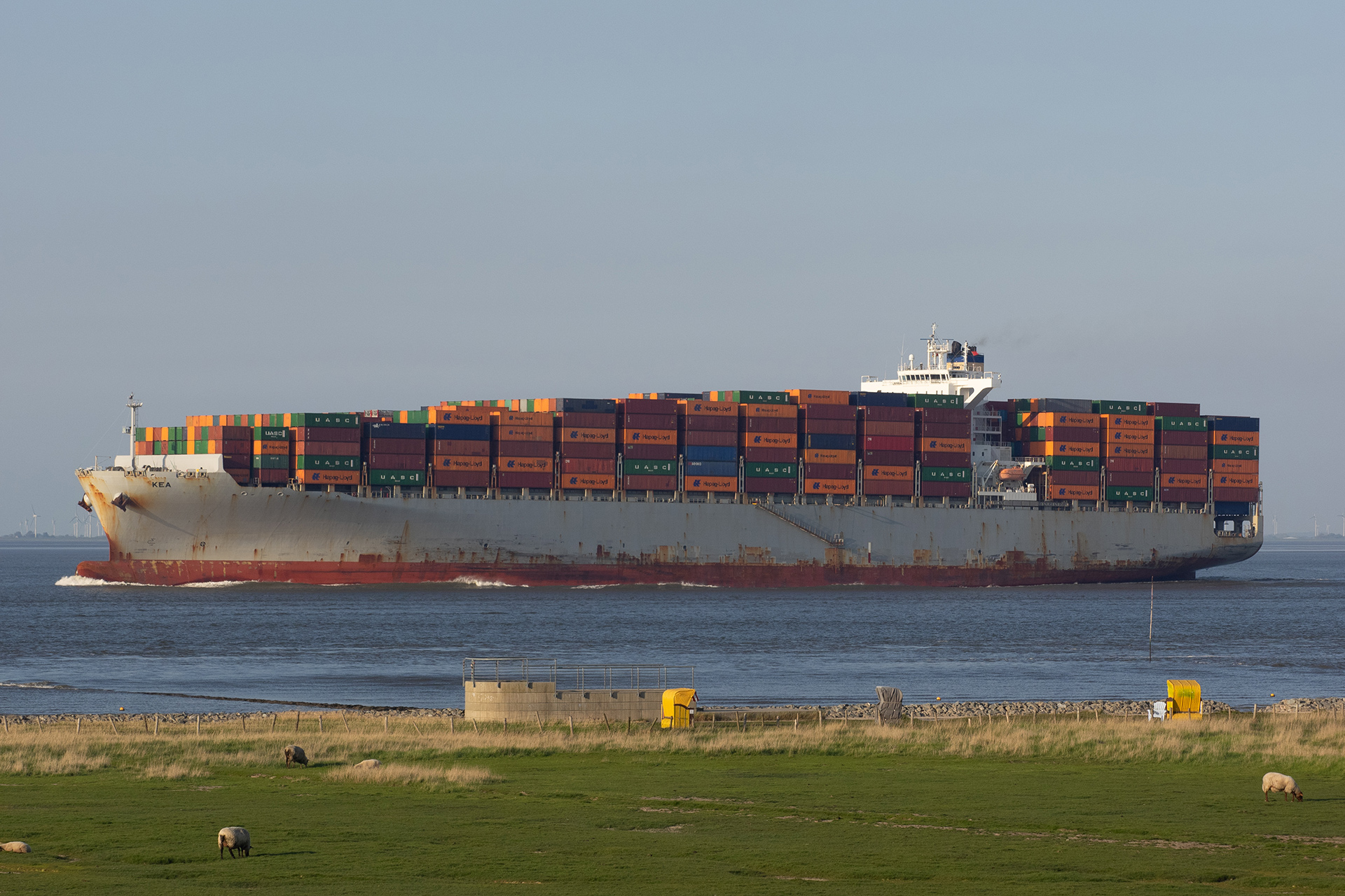 Containerschiff elbabwärts vor Cuxhaven-Altenbruch am 09.05.2020