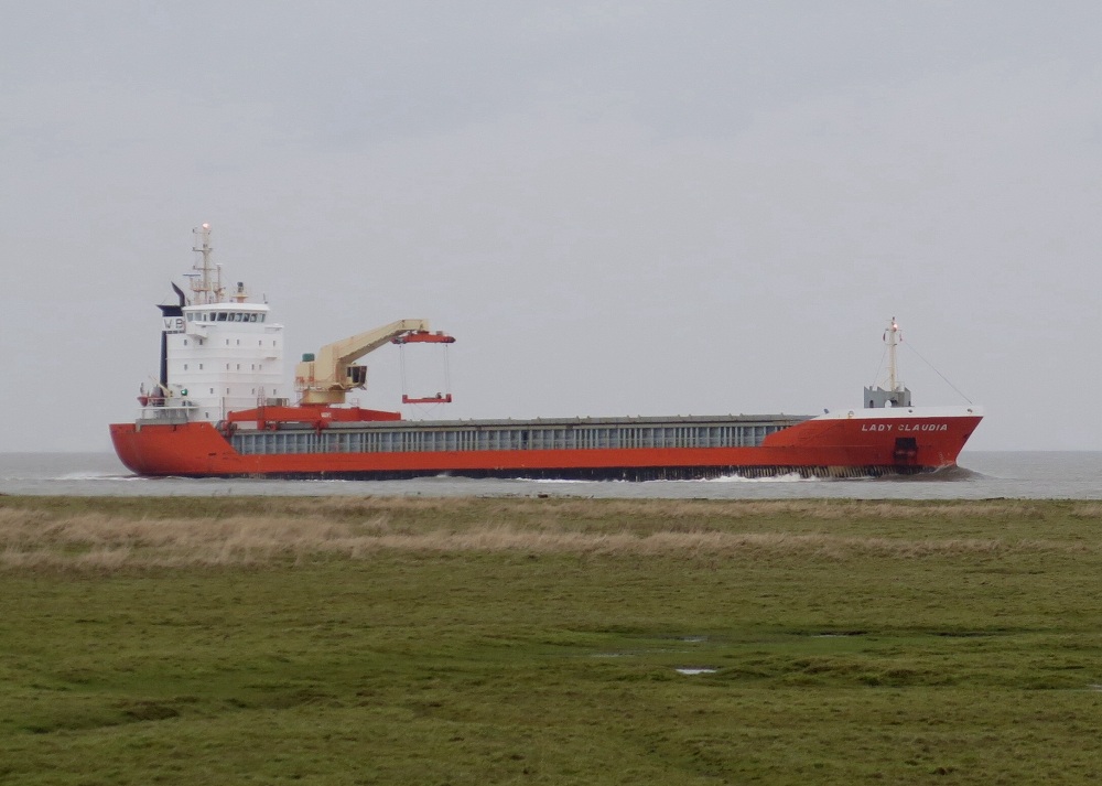 Frachtschiff elbaufwärts vor Cuxhaven-Altenbruch am 09.02.2014