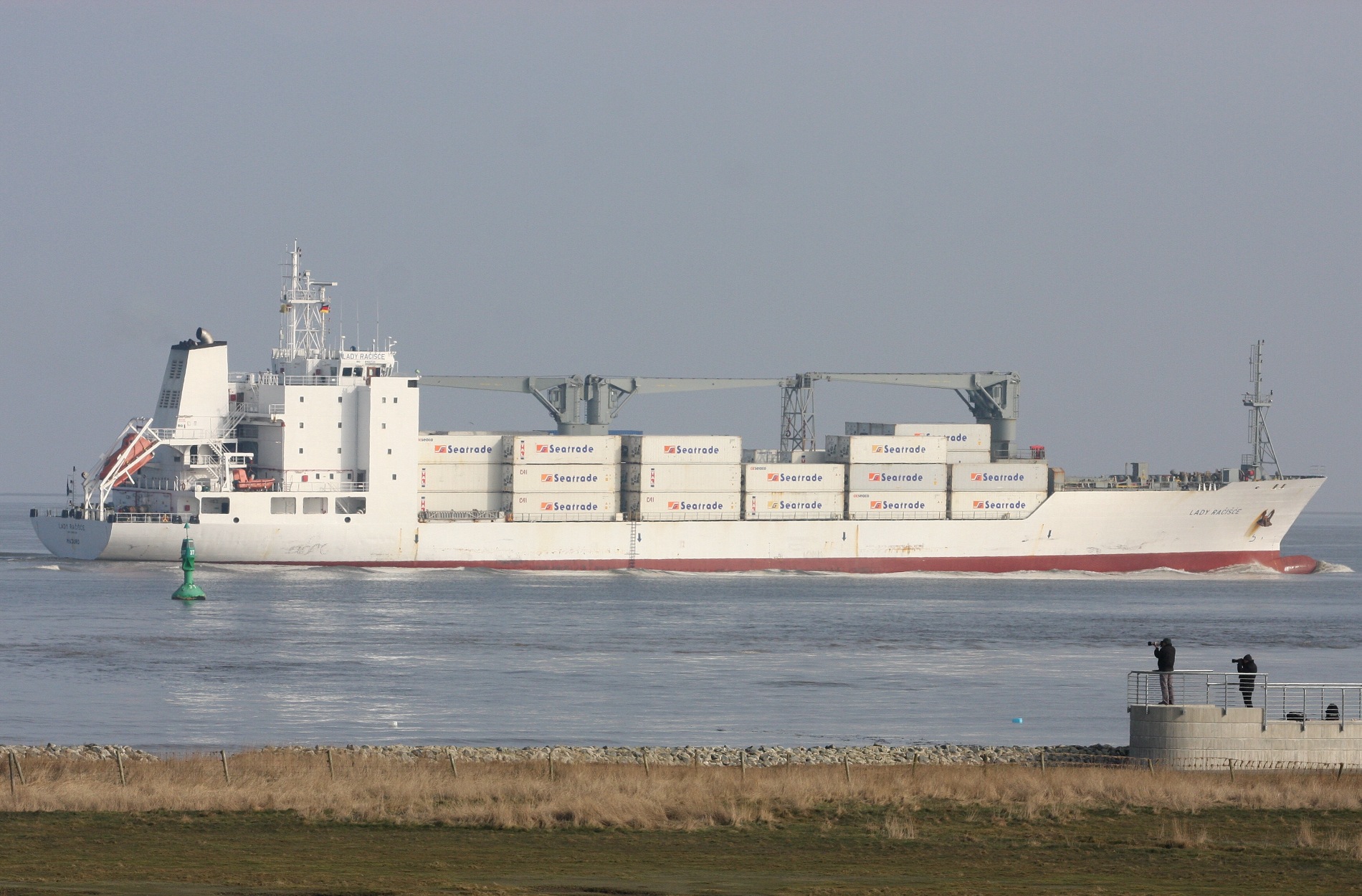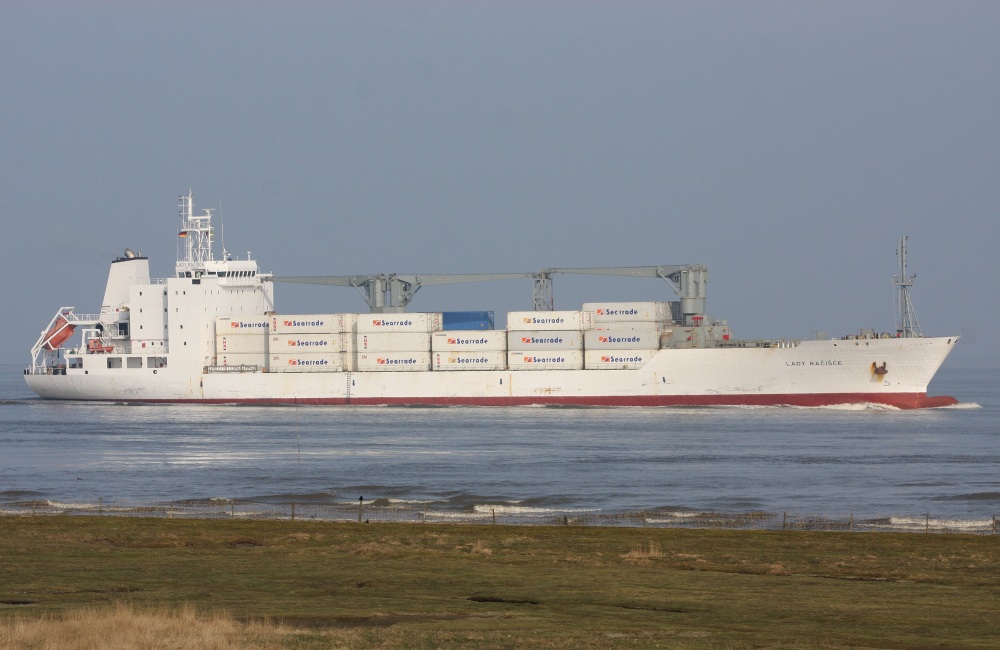 Frachtschiff elbaufwärts vor Cuxhaven-Altenbruch am 27.02.2013