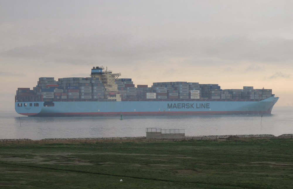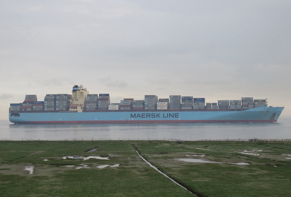 Containerschiff elbaufwärts vor Cuxhaven-Altenbruch am frühen Morgen des 14.04.2012