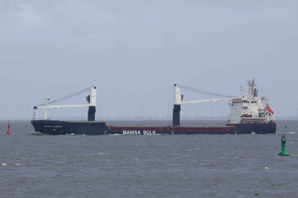 Frachtschiff elbabwärts vor Cuxhaven-Altenbruch am 05.05.2019