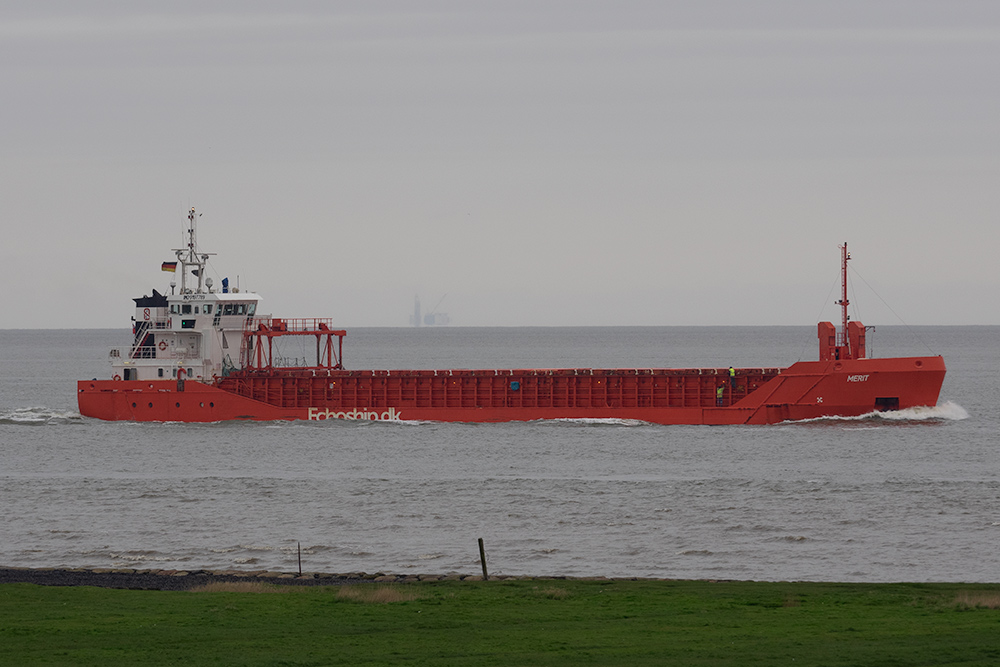 Frachtschiff elbaufwärts vor Cuxhaven-Altenbruch am 03.04.2024