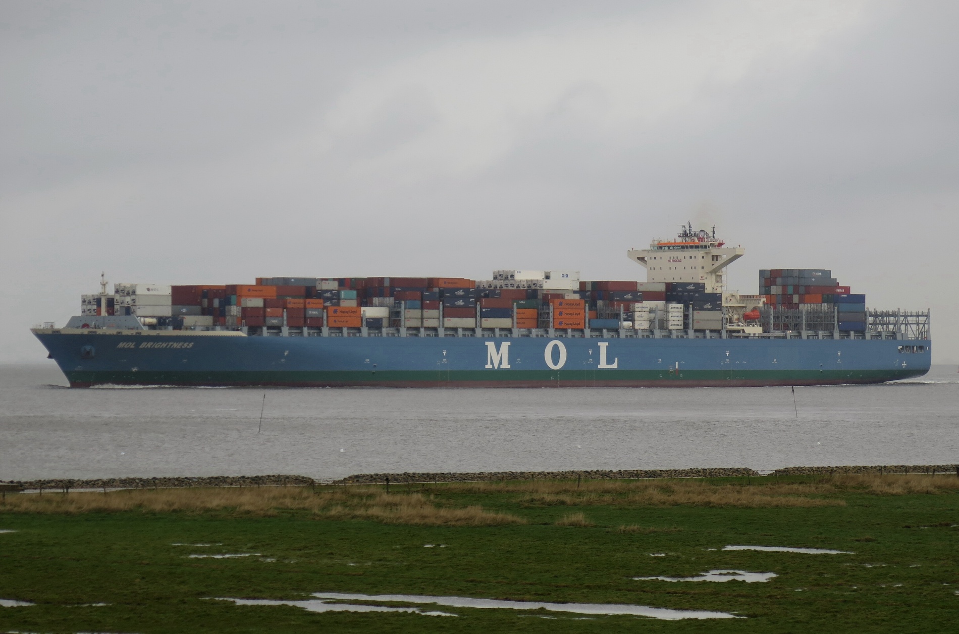 Containerschiff elbabwärts vor Cuxhaven-Altenbruch am 21.12.2014