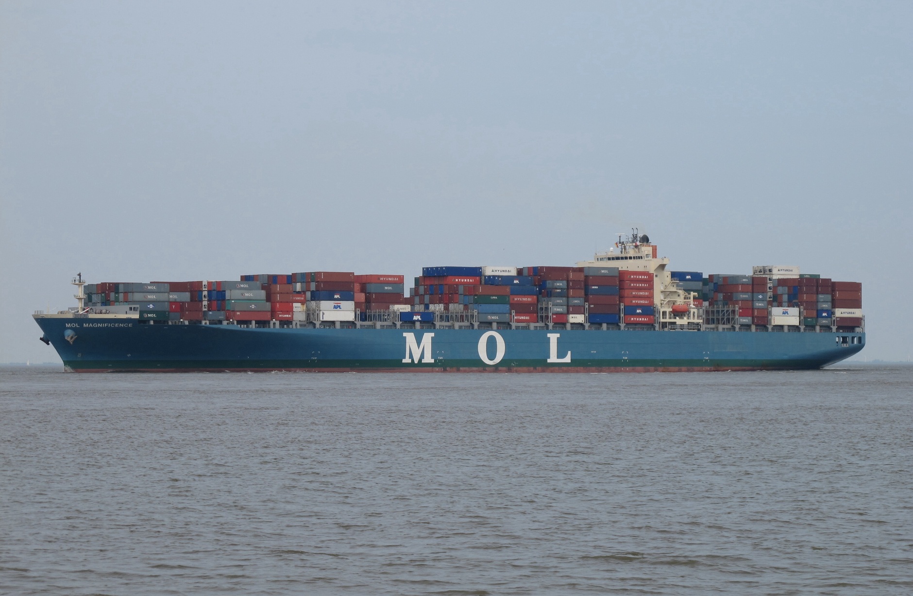 Containerschiff elbaufwärts in Höhe Glameyer Stack am 03.08.2011