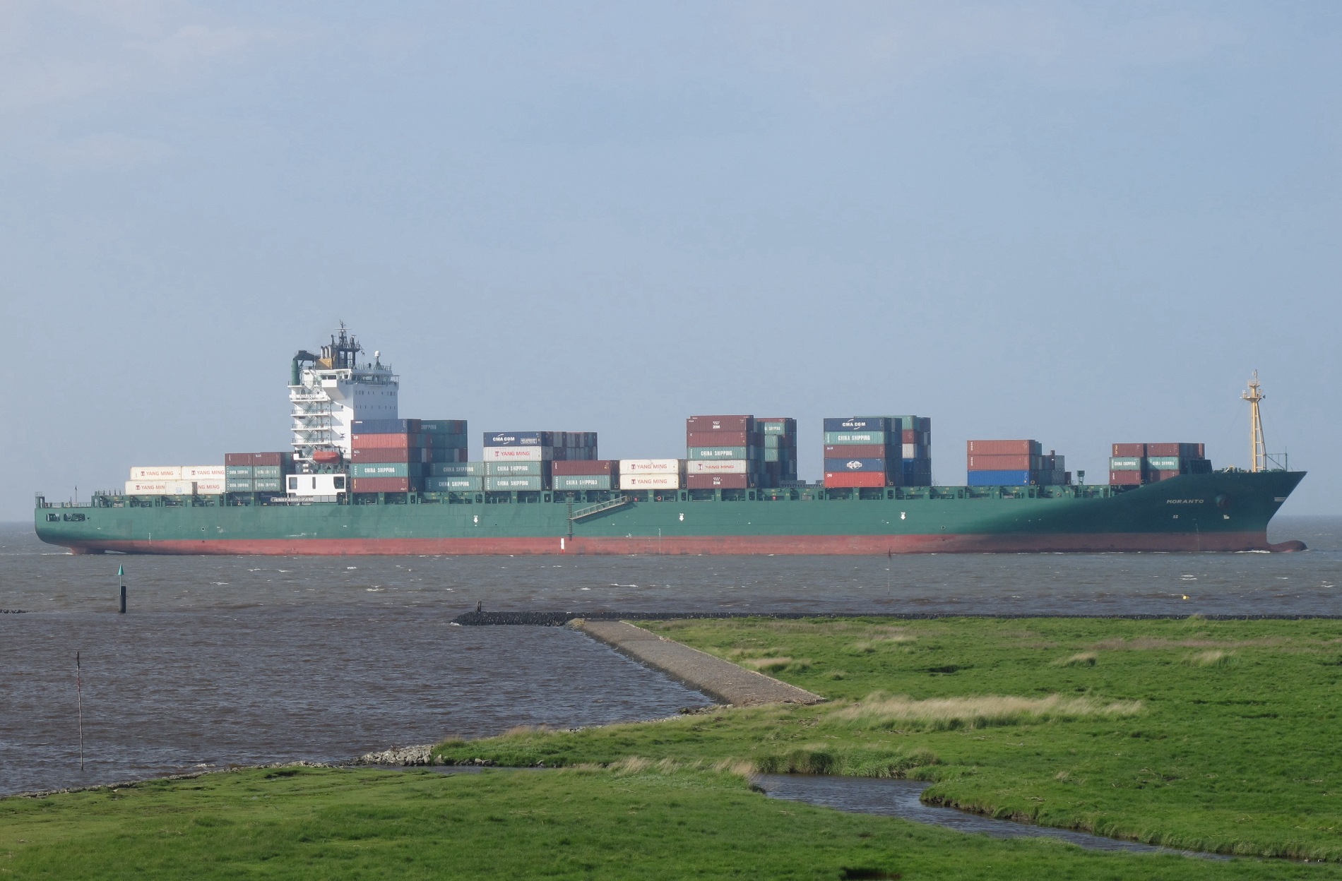 Containerschiff elbaufwärts vor Cuxhaven-Altenbruch am 31.05.2013