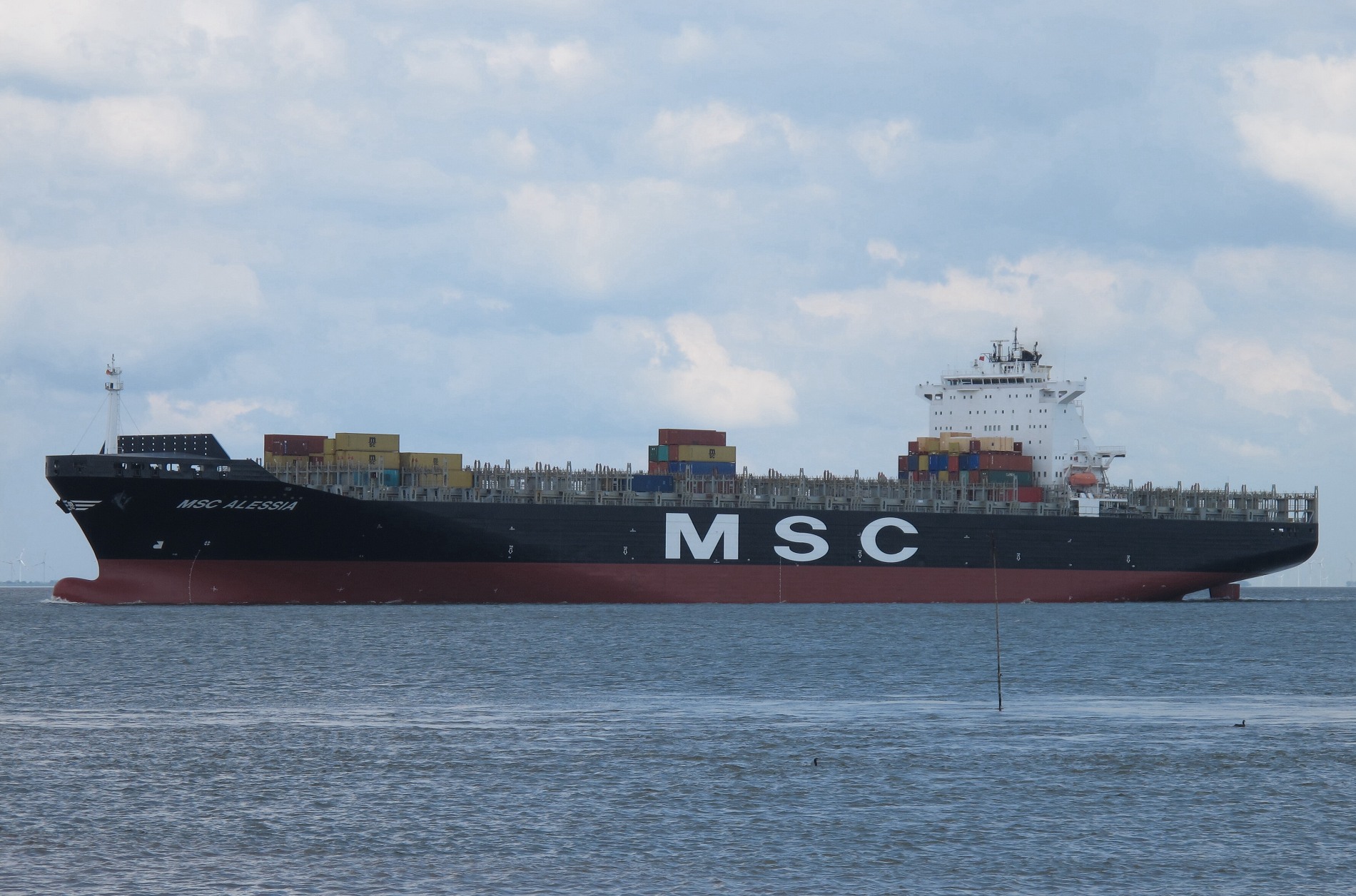 fast leeres Containerschiff seewärts fahrend vor Cuxhaven-Altenbruch am 01.07.2012