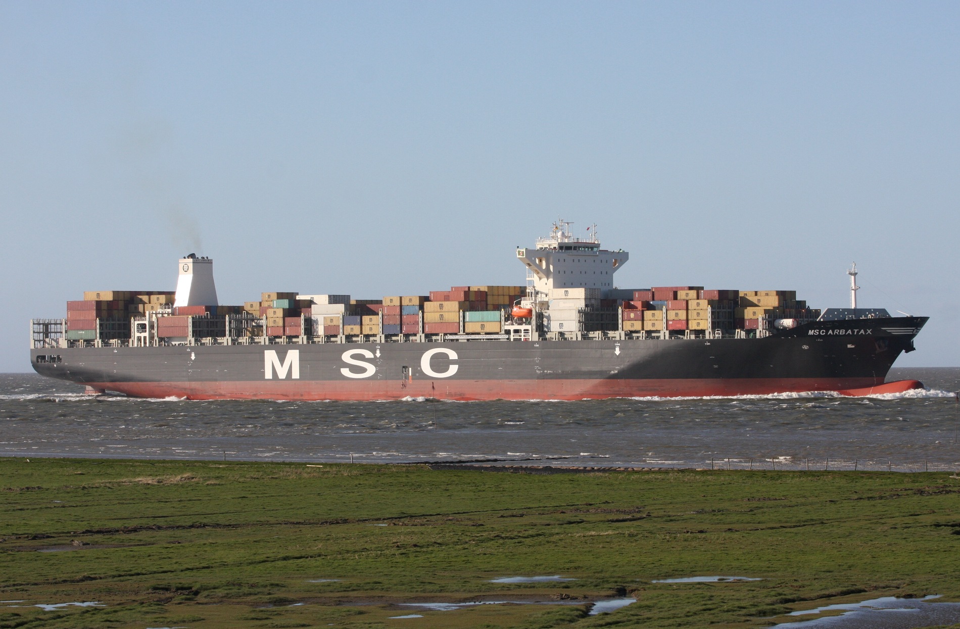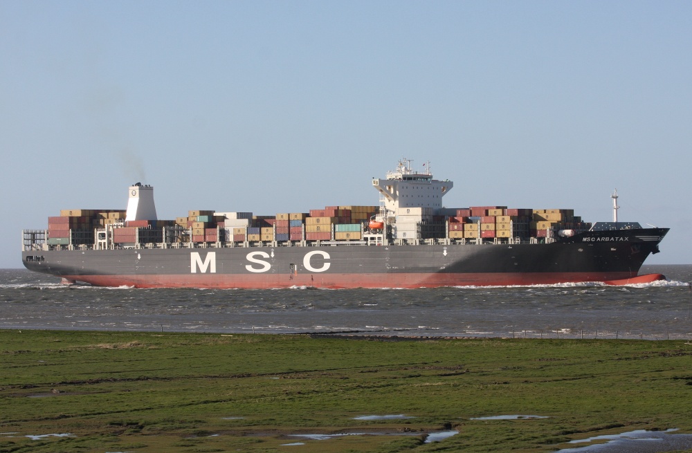 Containerschiff elbaufwärts vor Cuxhaven-Altenbruch am 15.04.2014