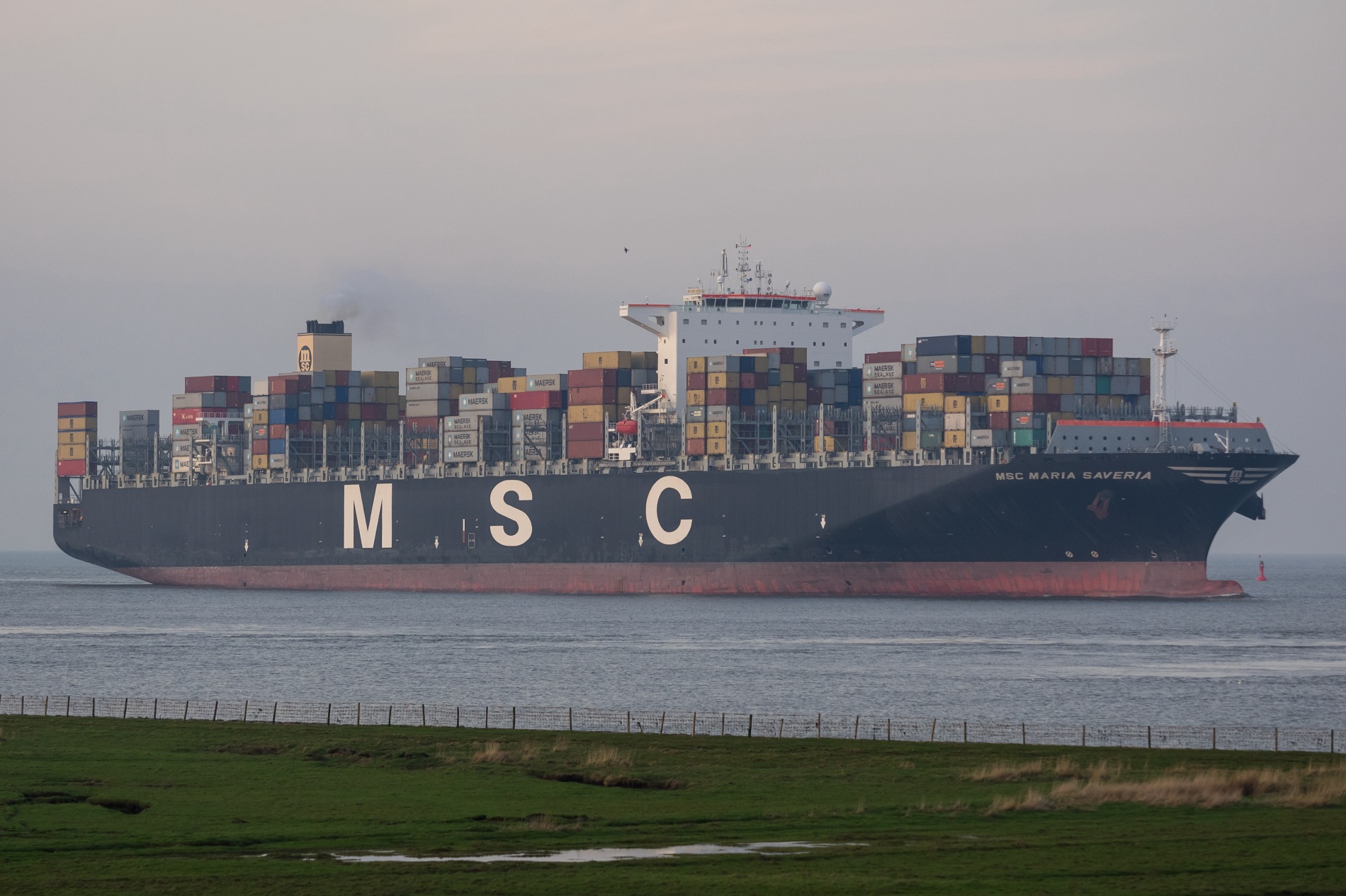 Containerschiff elbaufwärts vor Cuxhaven-Altenbruch am 31.12.2015
