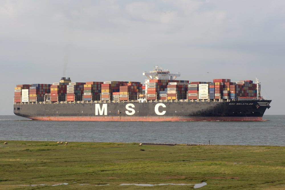 Containerschiff elbaufwärts vor Cuxhaven-Altenbruch am 06.08.2019