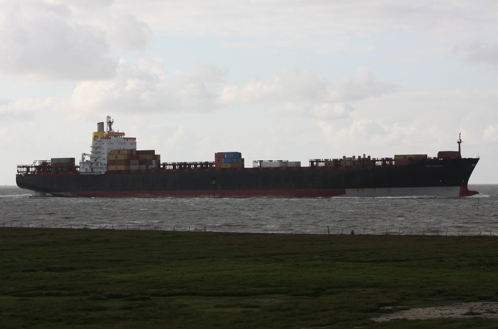 Containerschiff elbaufwärts vor Cuxhaven-Altenbruch am 08.06.2015