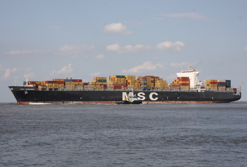 Containerschiff elbabwärts in Höhe Glameyer Stack am 14.07.2009