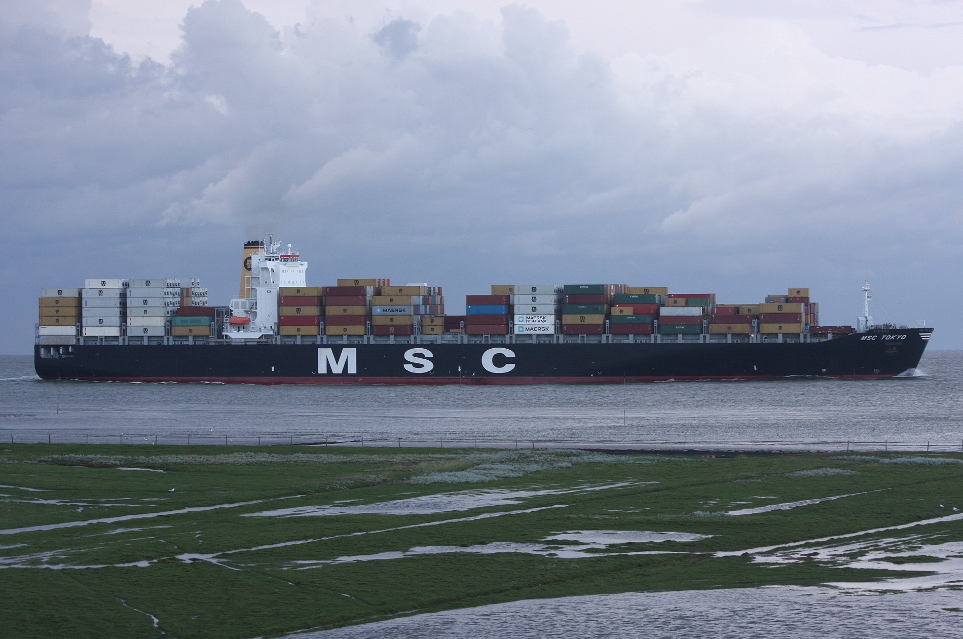 Containerschiff elbaufwärts vor Cuxhaven-Altenbruch am 24.08.2010