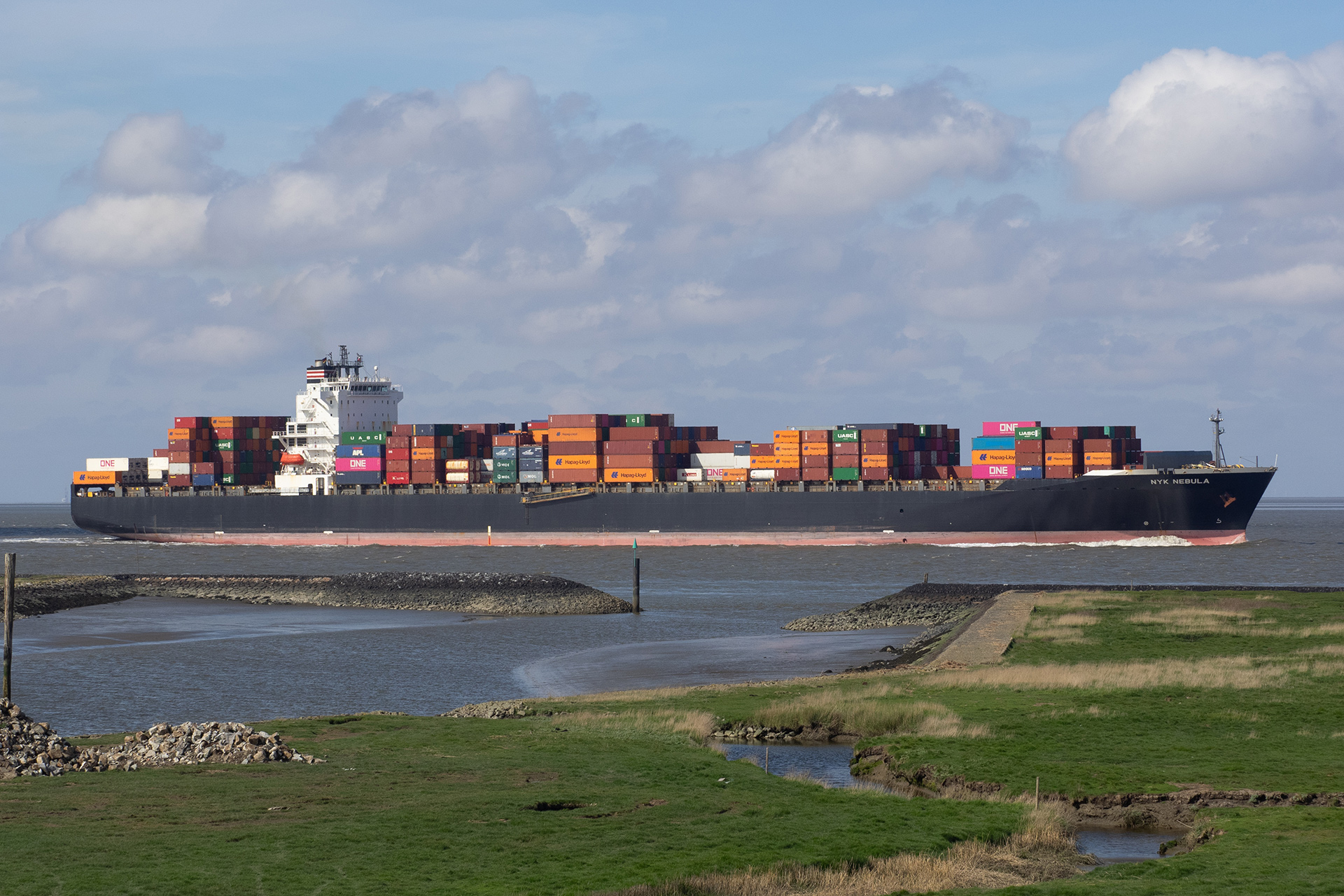 Containerschiff elbaufwärts vor Cuxhaven-Altenbruch am 03.05.2020