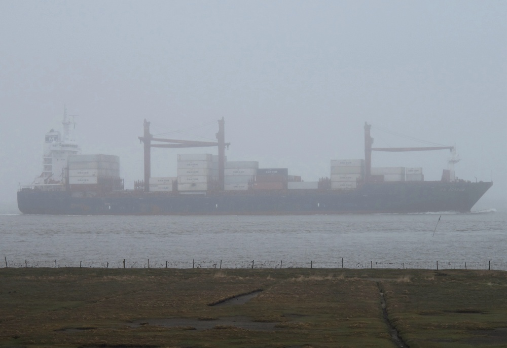 Frachtschiff elbaufwärts vor Cuxhaven-Altenbruch am 13.04.2013
