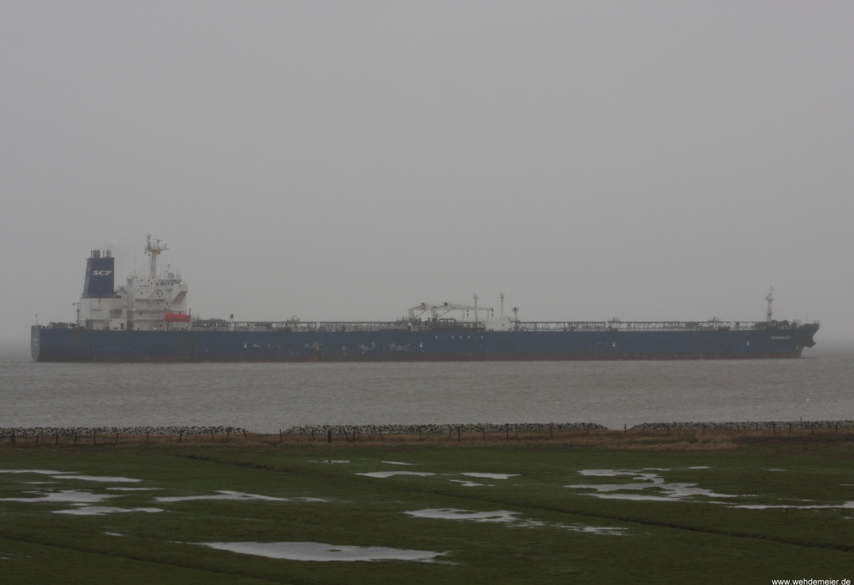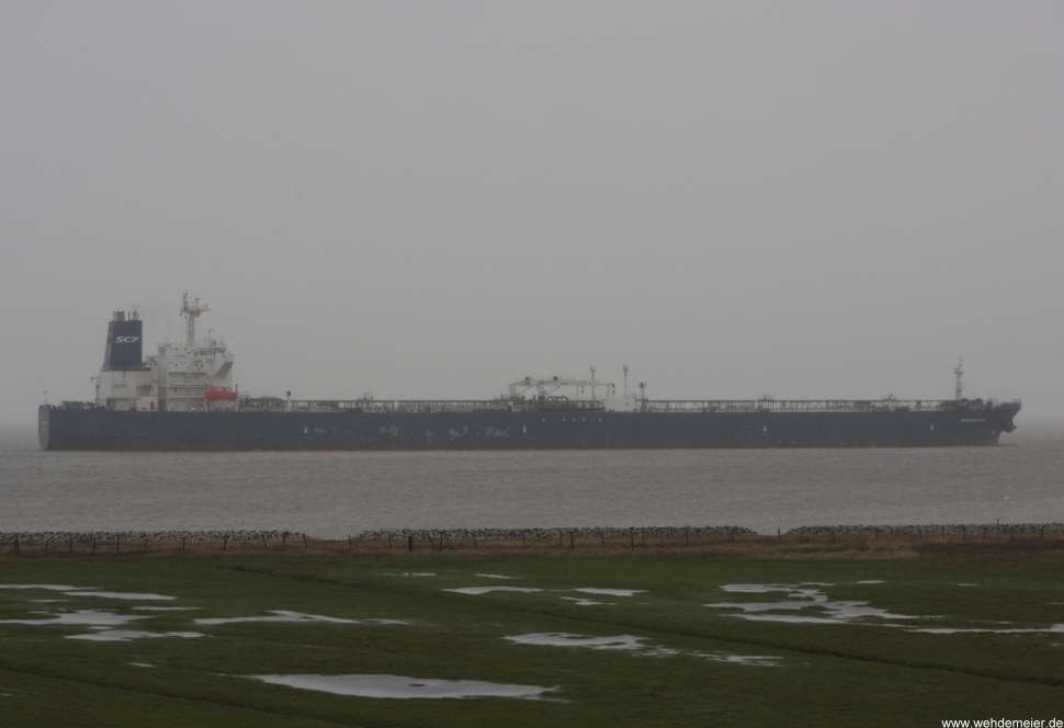 Tanker bei Regenwetter elbaufwärts vor Cuxhaven-Altenbruch am 06.02.2011
