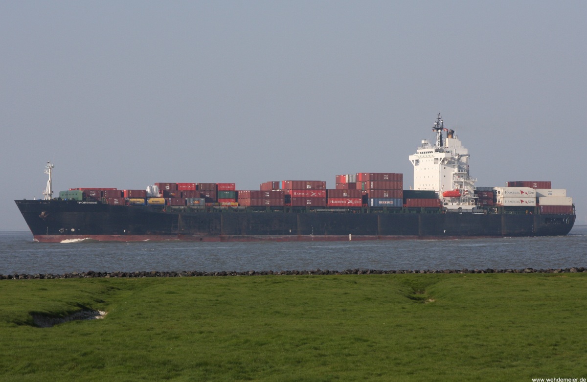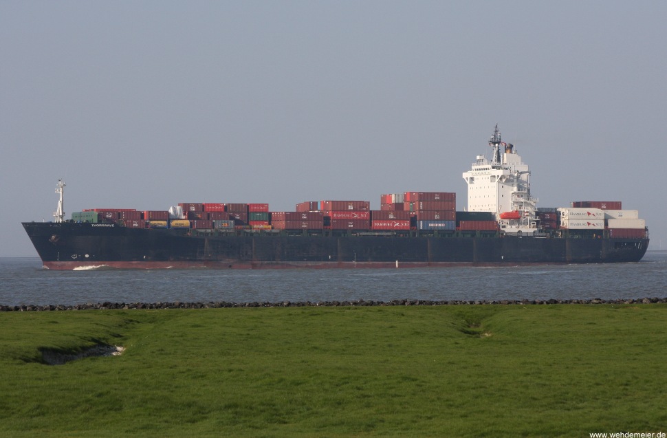 Containerschiff elbabwärts vor Cuxhaven-Altenbruch am 21.04.2009