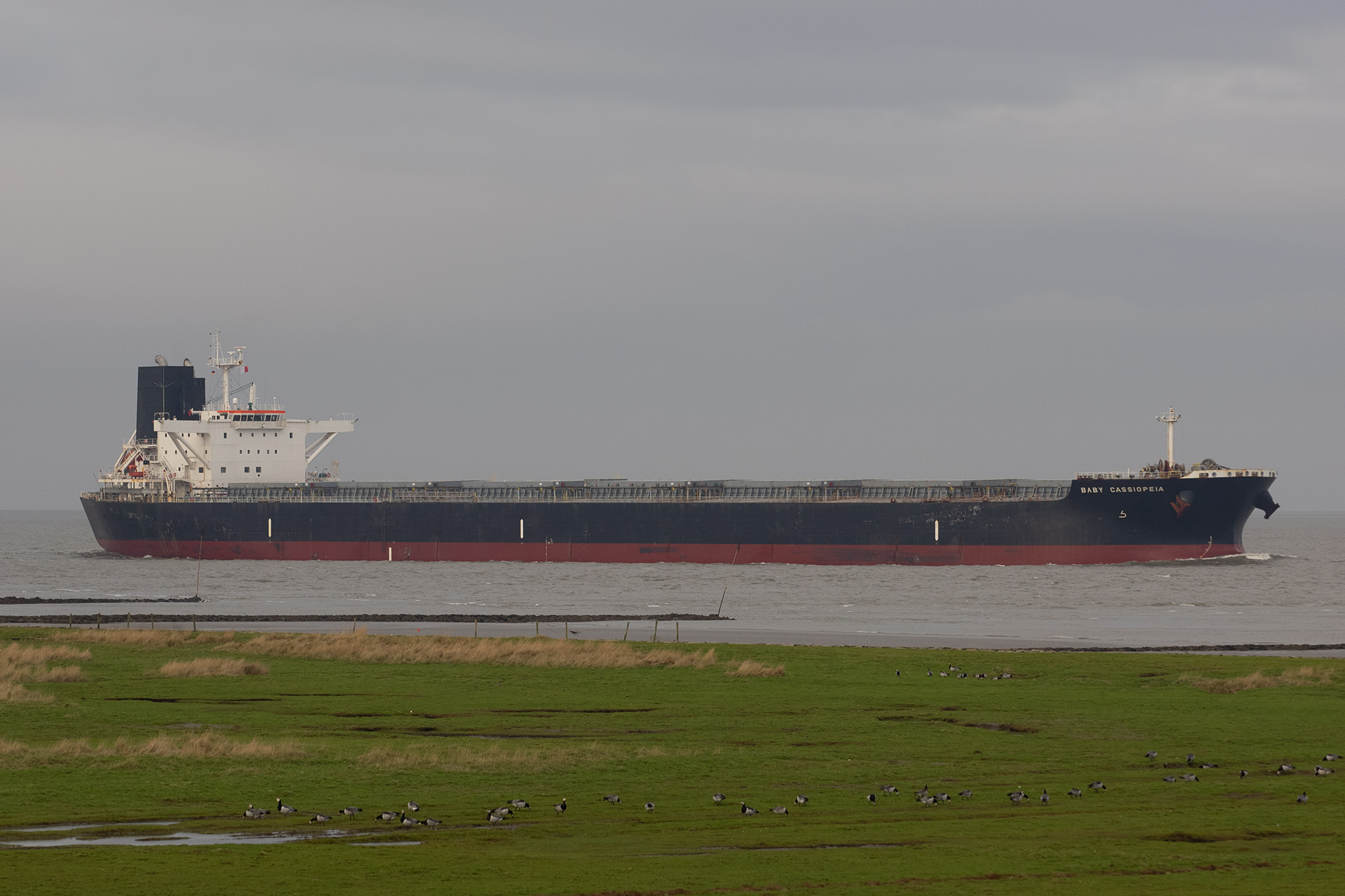 Massengutfrachter elbaufwärts vor Cuxhaven-Altenbruch am 11.12.2021
