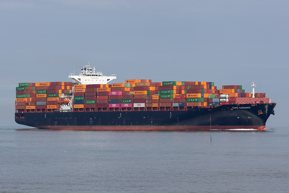Containerschiff elbaufwärts vor Cuxhaven-Altenbruch am 04.07.2021