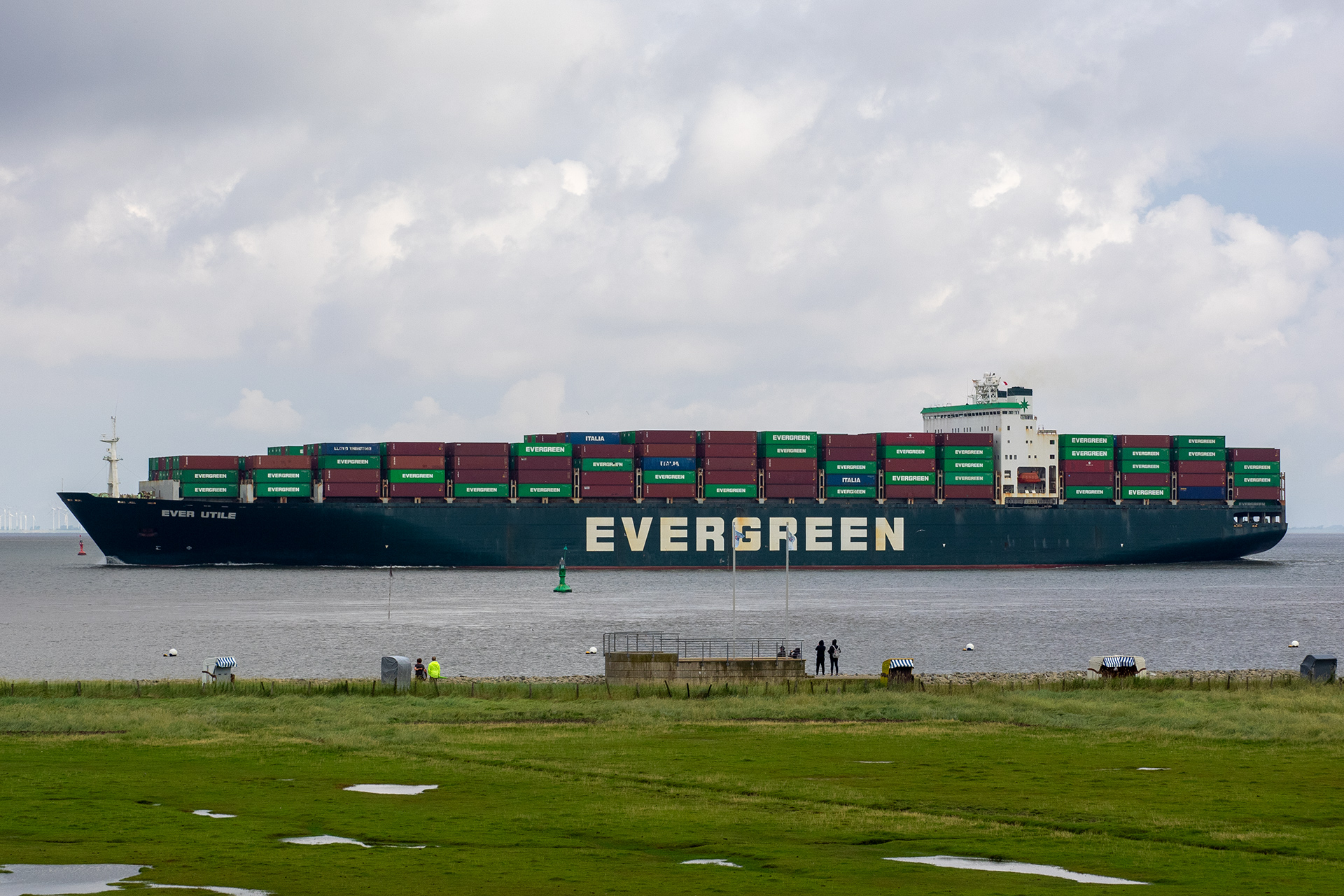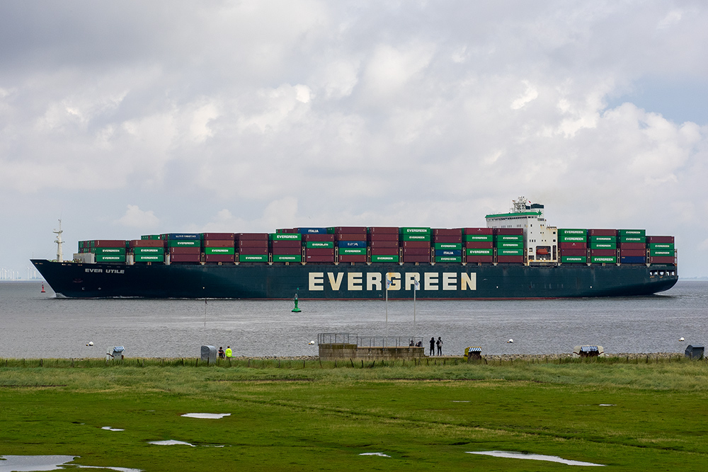 Containerschiff elbabwärts vor Cuxhaven-Altenbruch am 10.08.2021