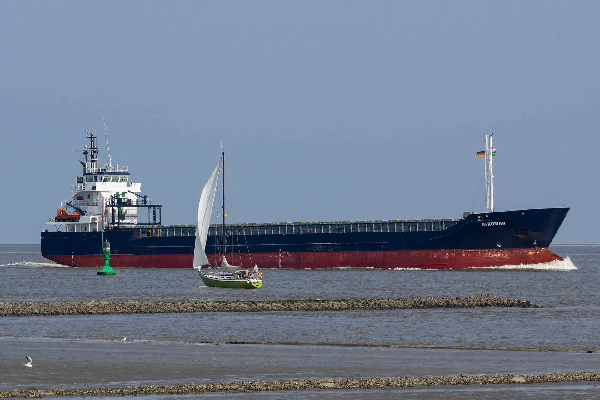 Frachtschiff elbaufwärts vor Cuxhaven-Altenbruch am 11.07.2021