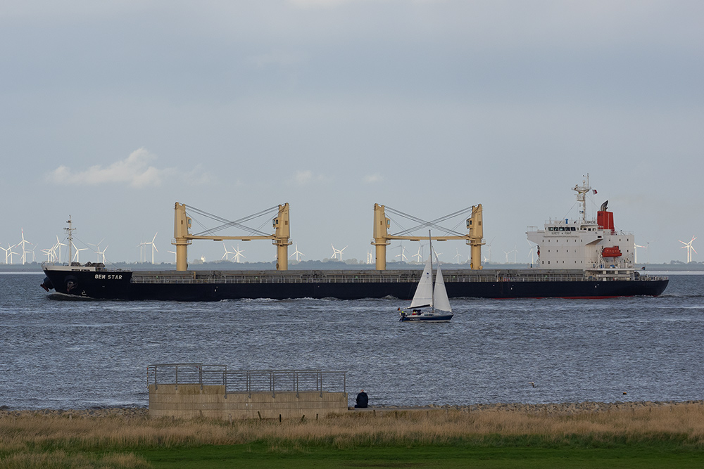 Frachtschiff elbaufwärts vor Cuxhaven-Altenbruch am 11.10.2020