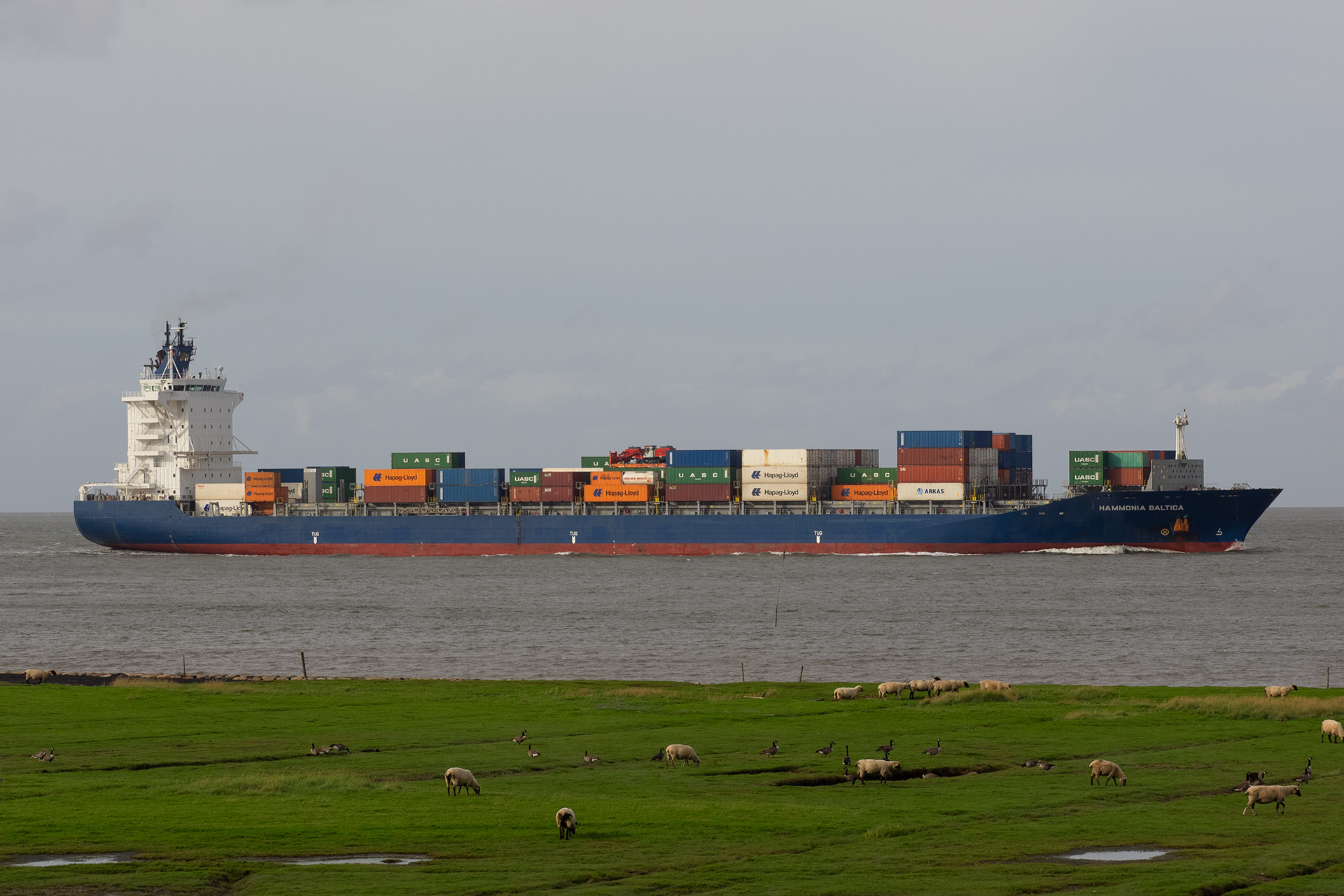 Containerschiff elbaufwärts vor Cuxhaven-Altenbruch am 12.09.2020