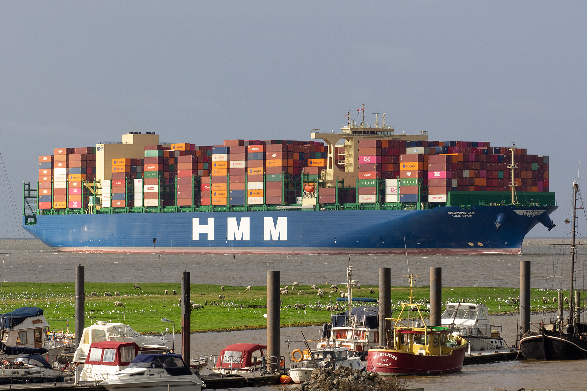 Containerschiff elbaufwärts vor Cuxhaven-Altenbruch am 27.08.2021