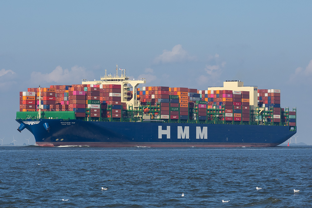 Containerschiff elbabwärts vor Cuxhaven-Altenbruch am 11.08.2021
