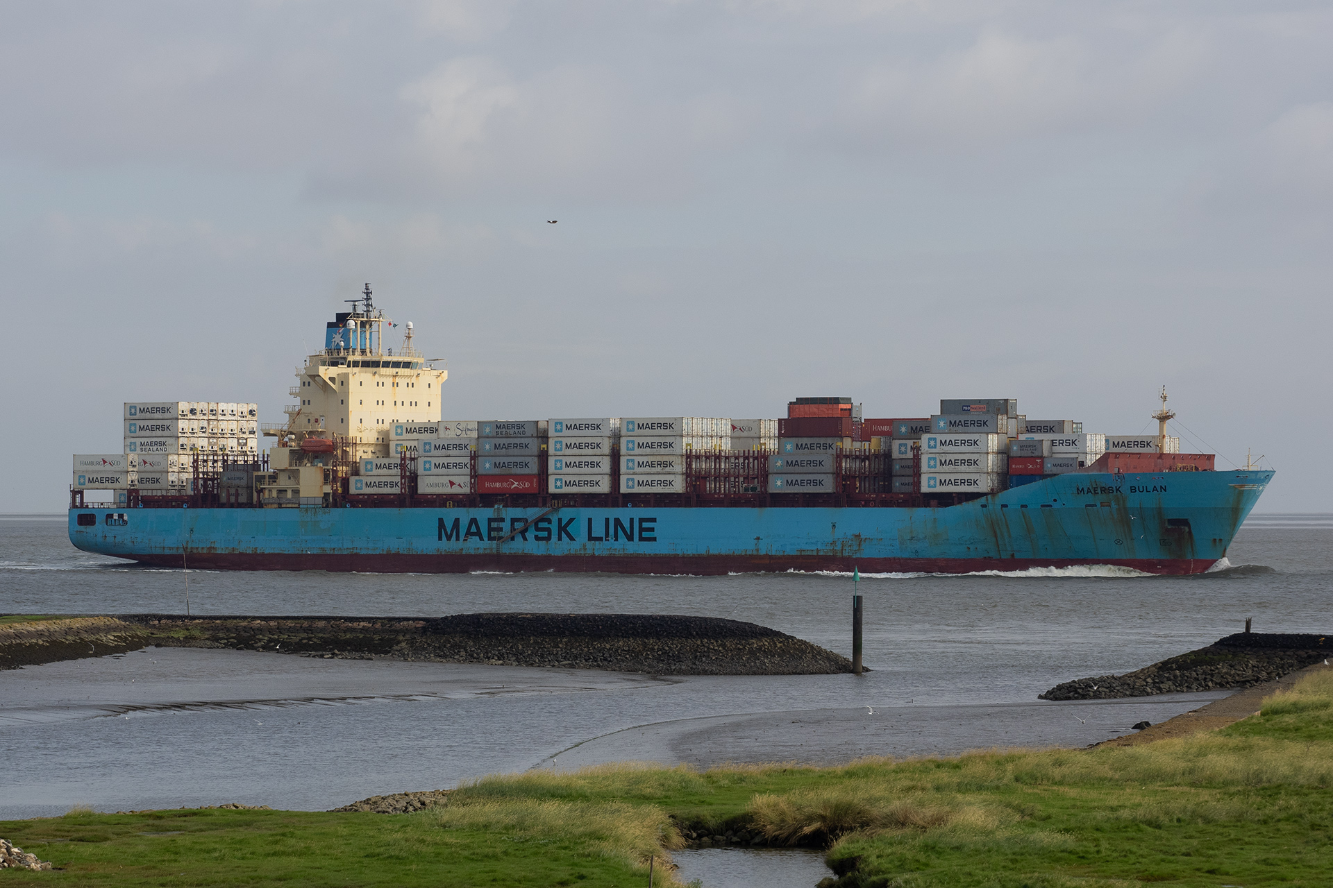 Containerschiff elbaufwärts vor Cuxhaven-Altenbruch am 09.08.2021