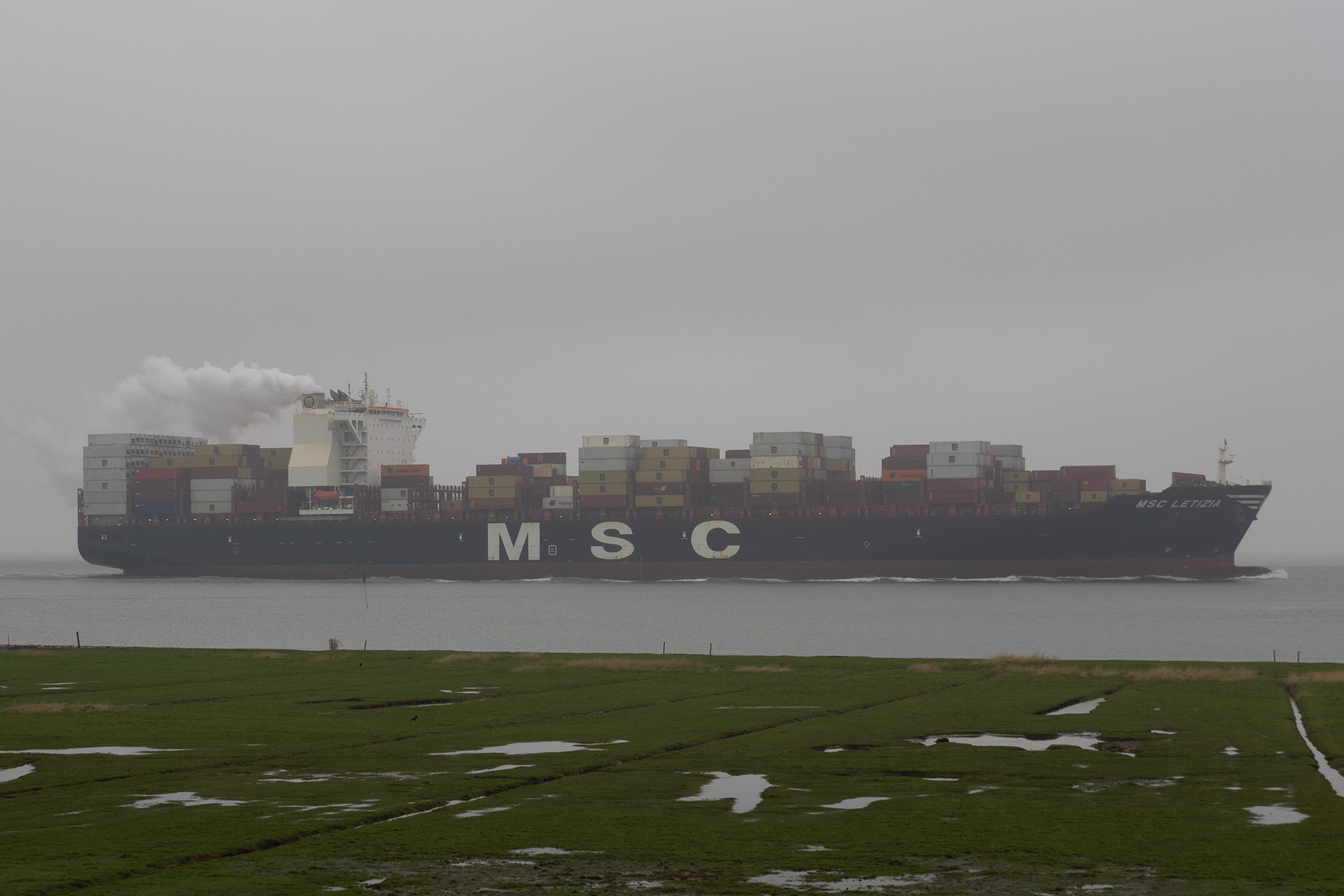 Containerschiff elbaufwärts vor Cuxhaven-Altenbruch am 04.12.2021