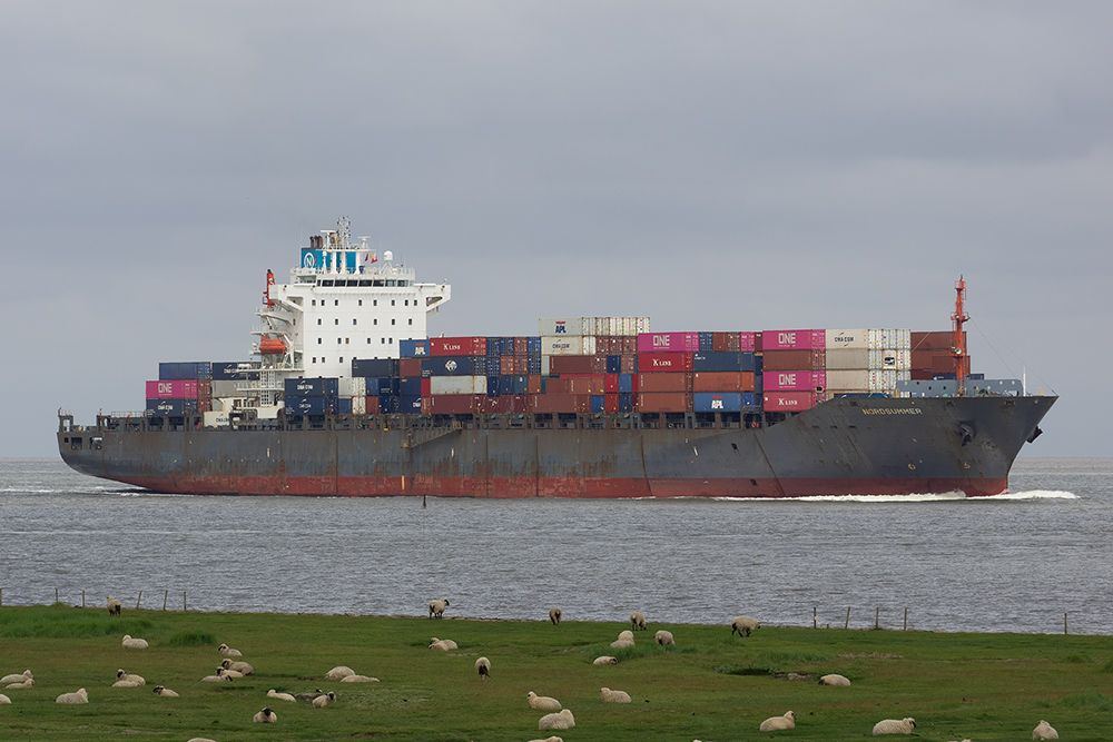 Containerschiff elbaufwärts vor Cuxhaven-Altenbruch am 23.06.2021